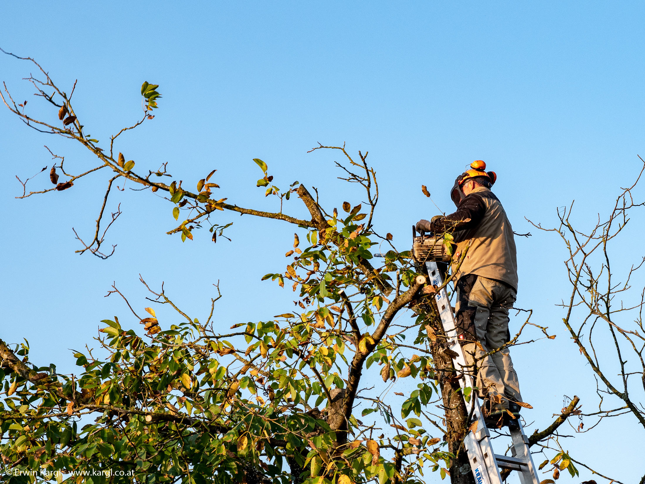 Aufgrund einer starken Verletzung durch Sonnenbrand und einem Sturmschaden vor zwei Wochen, musste ein Nussbaum optimal eingekürzt werden. Das Ziel ist es, diesen Baum trotz der starken Verletzungen zu erhalten. Durch den Erhaltungschnitt wird Druck vom Stamm genommen und der Baum hat die Möglichkeit sich zu erholen.